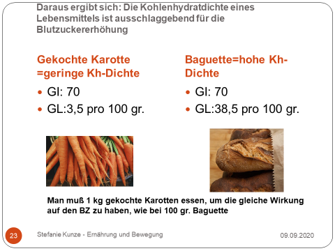 Der Grundgedanke ist: Wieviel Gramm der Kohlenhydrate eines Lebensmittels steigern den Blutzucker und damit auch die Insulinmenge im Blut. Daraus folgt, daß man wirklich eine große Menge gekochte Karotten essen kann, bevor man die gleichen Folgen im Stoffwechsel hat, wie beim Verzehr von gerade mal 100 gr. Weißbrot.